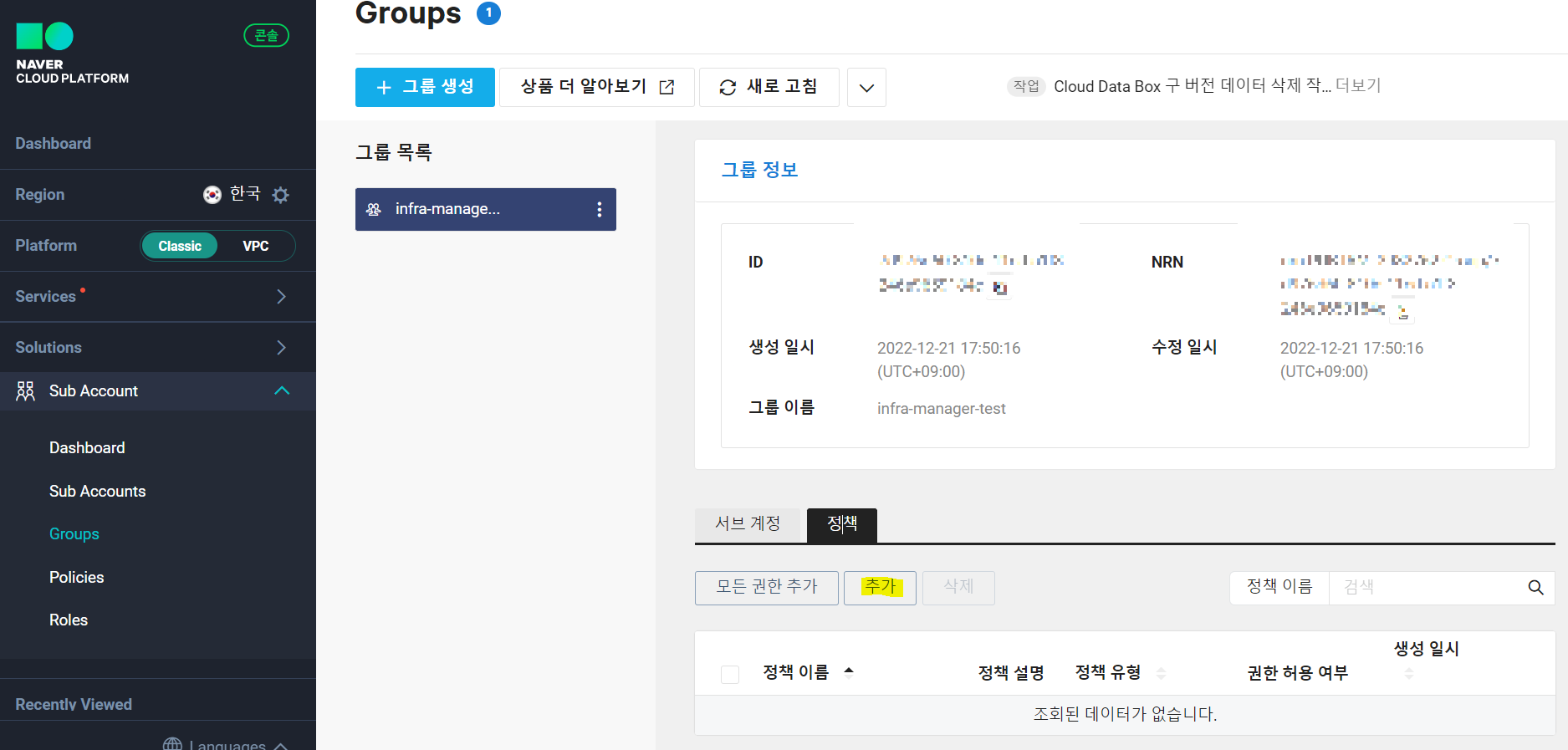 Sub Account 탭 > Groups > '정책 - 추가' 선택
