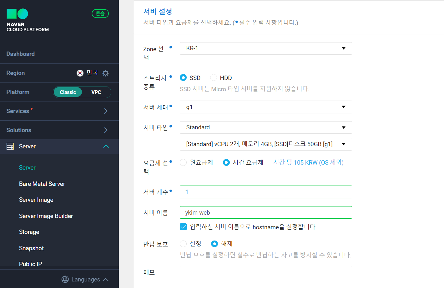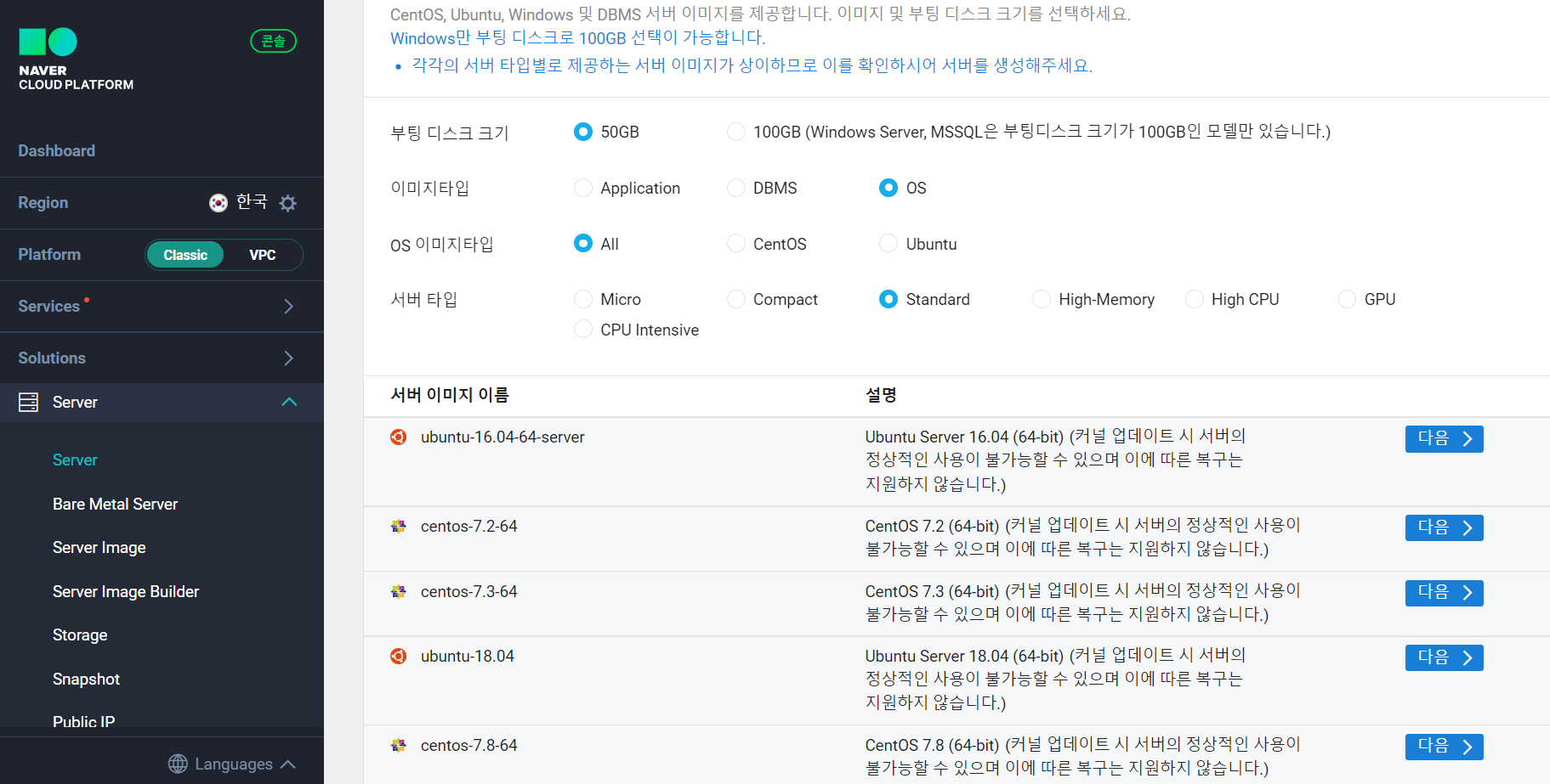 처음 서버를 구축하고자 하면 네트워크 환경에 따라 Classic플랫폼과 VPC플랫폼을 선택해야 한다. 구축하고자 하는 서비스가 단순하고 네트워크 설정에 대해 알아서 해주길 바 한다면 Classic 서버를, 네트워크에 대한 세부 내용을 직접 설정하고자 할 때는 VPC플랫폼 선택이 권장된다.