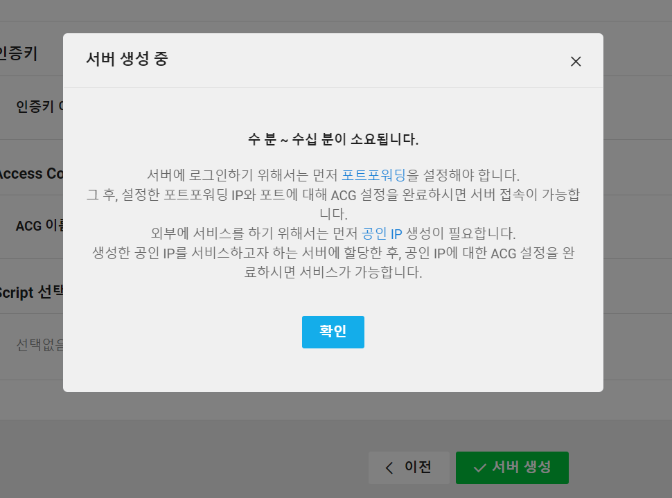 서버 관련 세부정보 확인 > '서버 생성' 선택