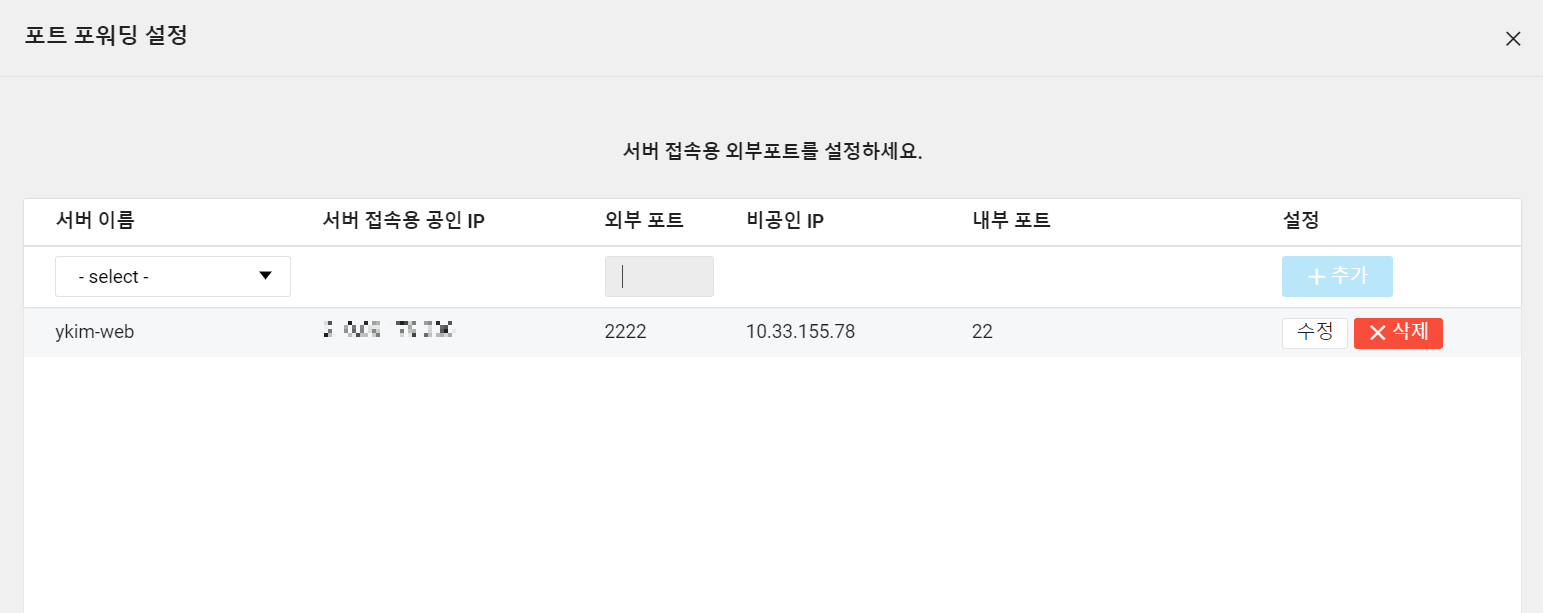 서버 > 서버 상세정보 > 포트 포워딩 정보
