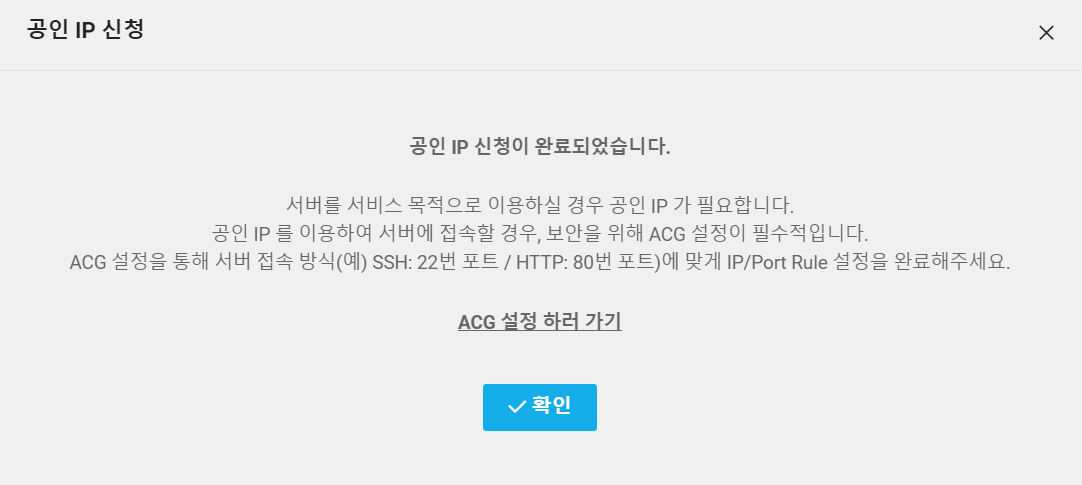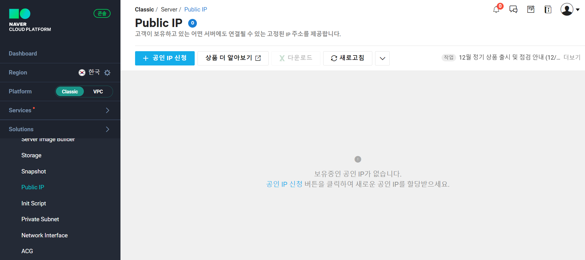 콘솔 > Server탭 > Public IP > '공인 IP 신청' 선택