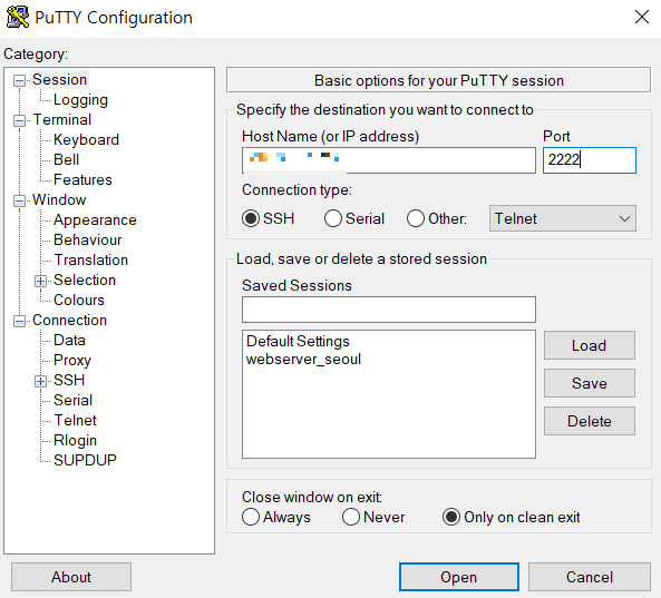 NCP에서 생성된 서버 접속을 위해 포트포워딩이 필요하다. 통상 사용되는 22번 포트는 직접 사용할 수 없으며 포워딩된 별도 외부 포트를 설정하여 SSH를 통한 접속이 가능하다.