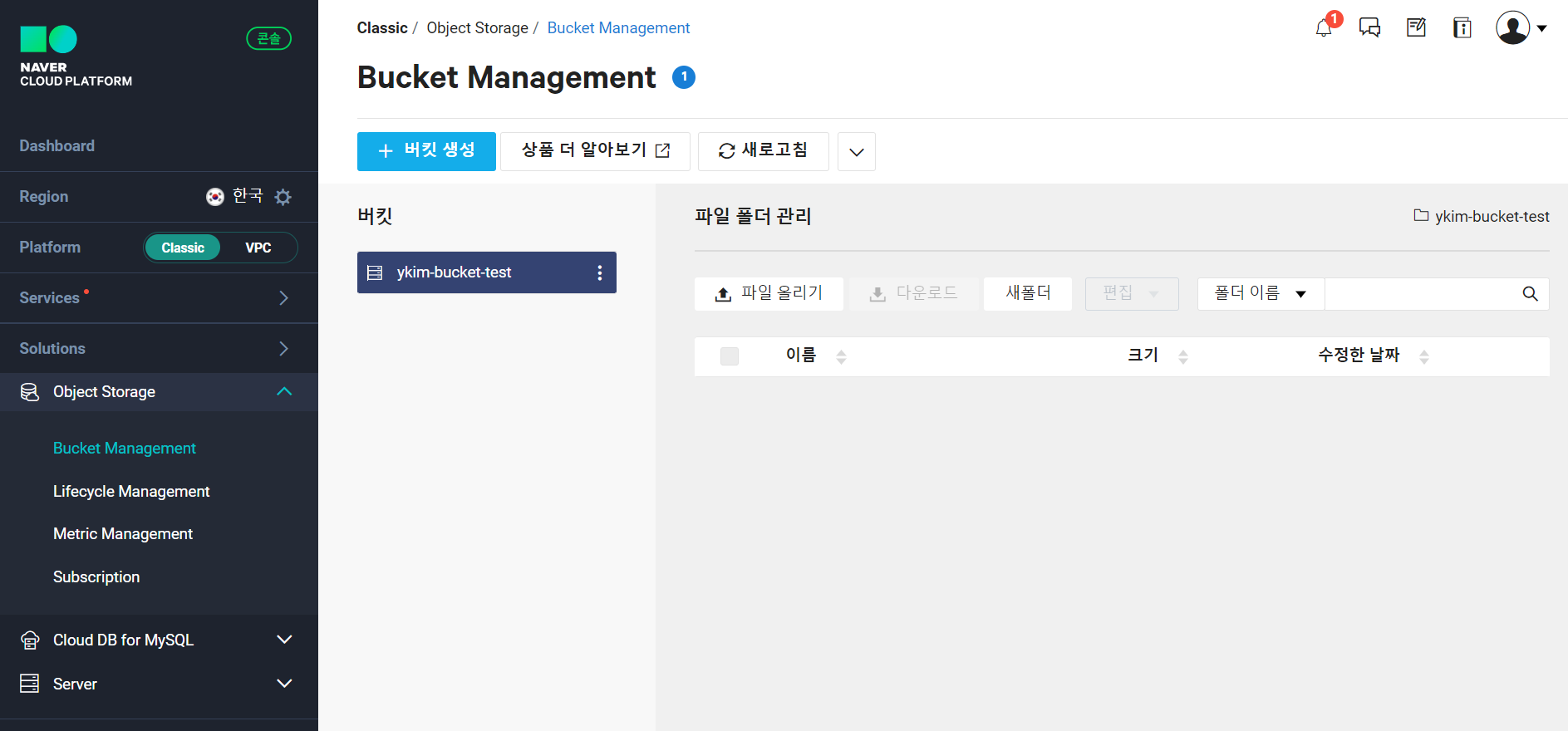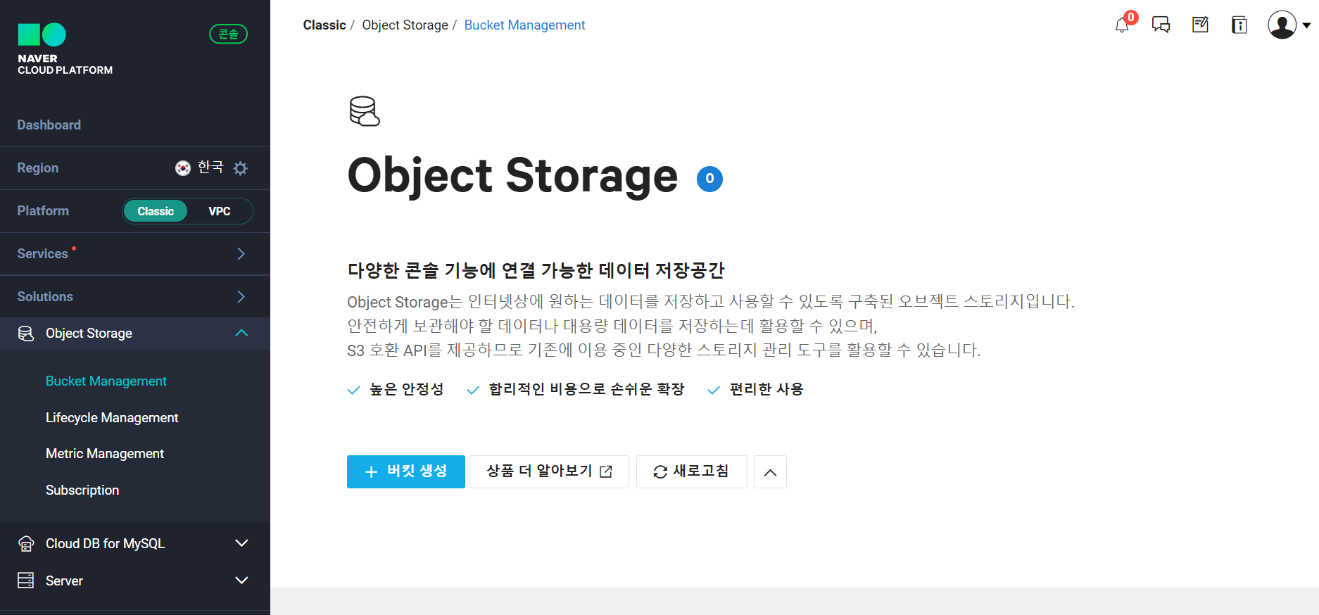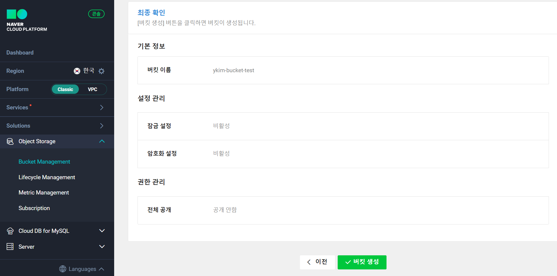 왼쪽 Object Storage 탭 > Bucket Management > '+버킷 생성' 선택