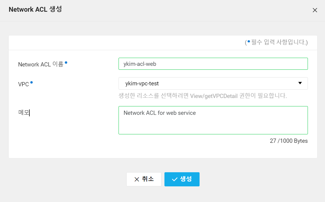 콘솔 > Service탭 > VPC > Network ACL > 'Network ACL 생성' 선택