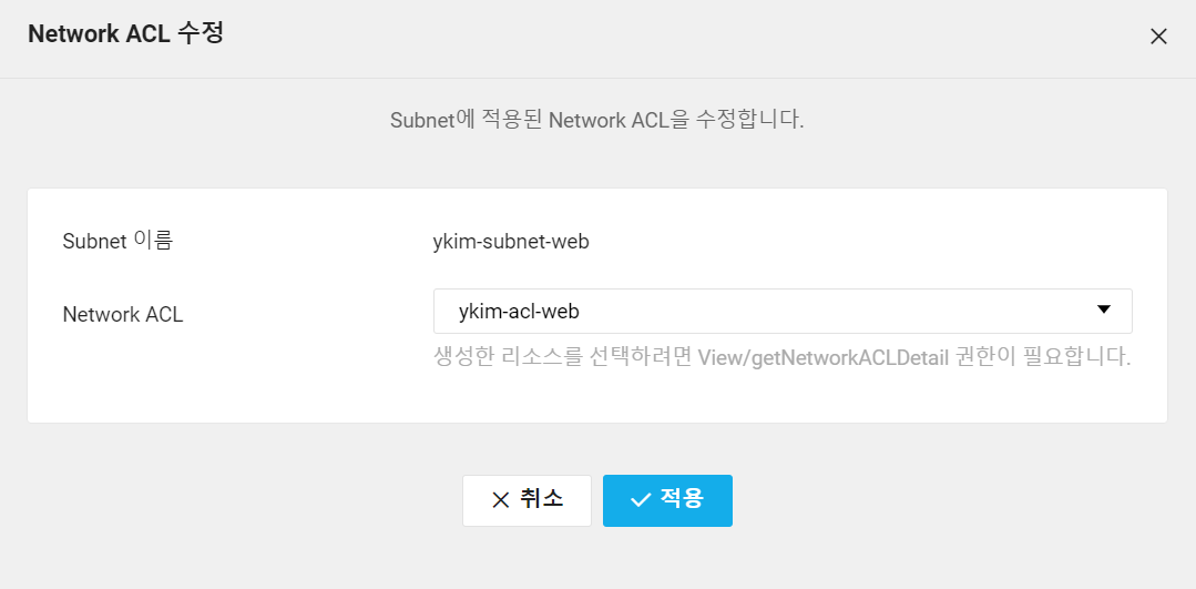 콘솔 > VPC > Subnet Management > Network ACL '변경' 선택