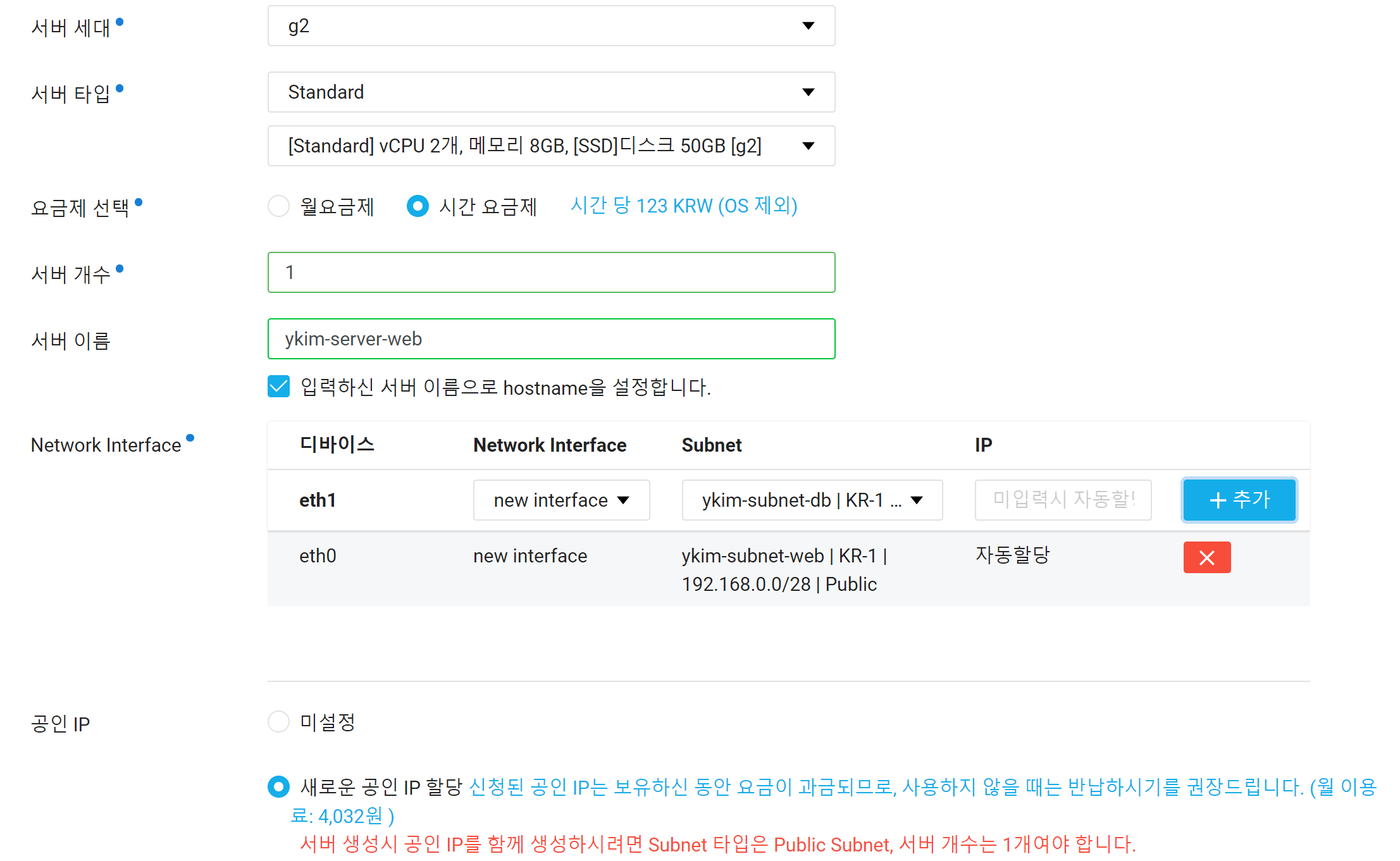 웹서버의 외부 접속 허용을 위해 인터넷 게이트 전용여부를 Y(Public) 선택한다.