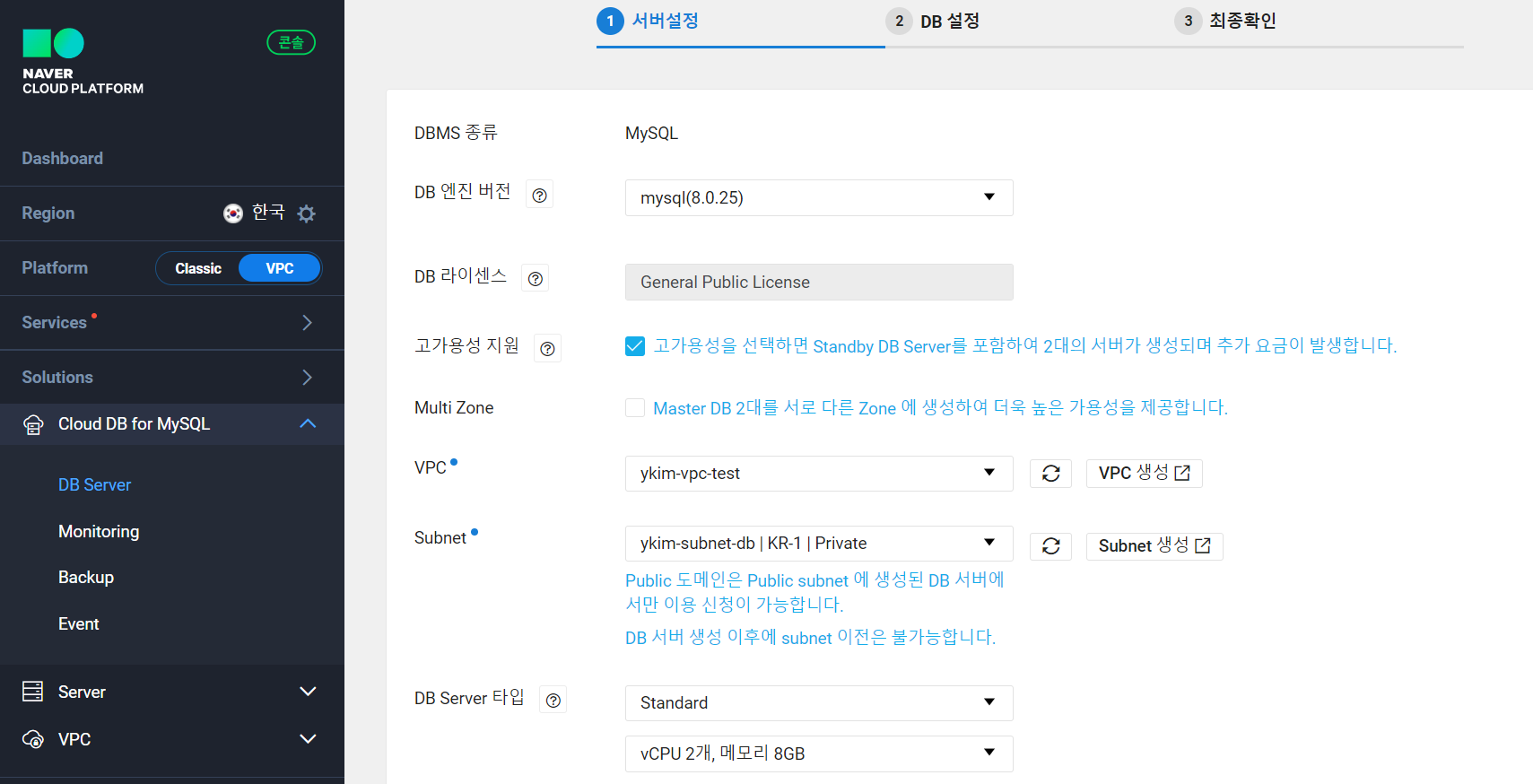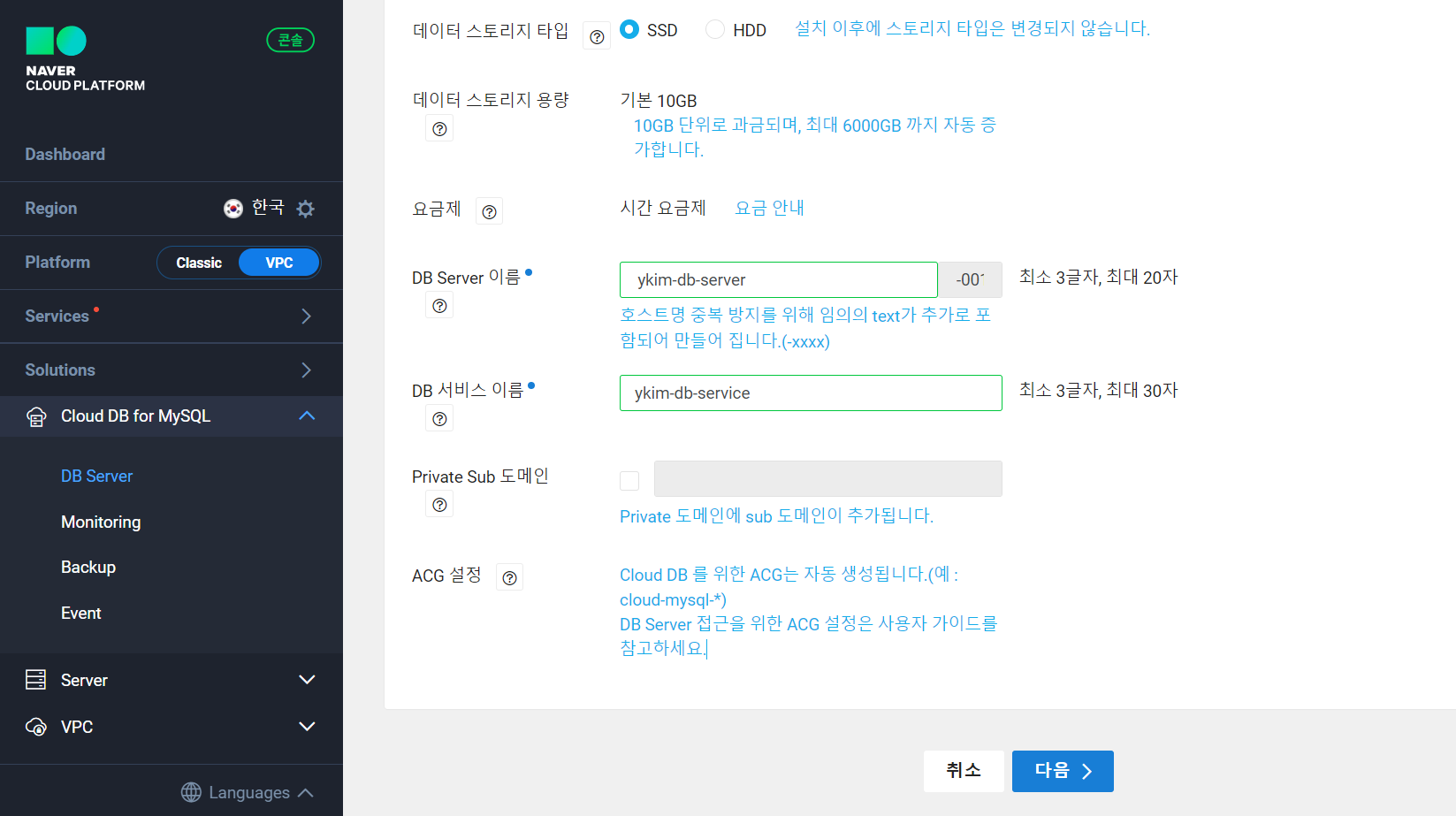 $ mysql -h Private 도메인 -u ykim -P 3306 -p // db-ei6g1.vpc-cdb.ntruss.com입력
