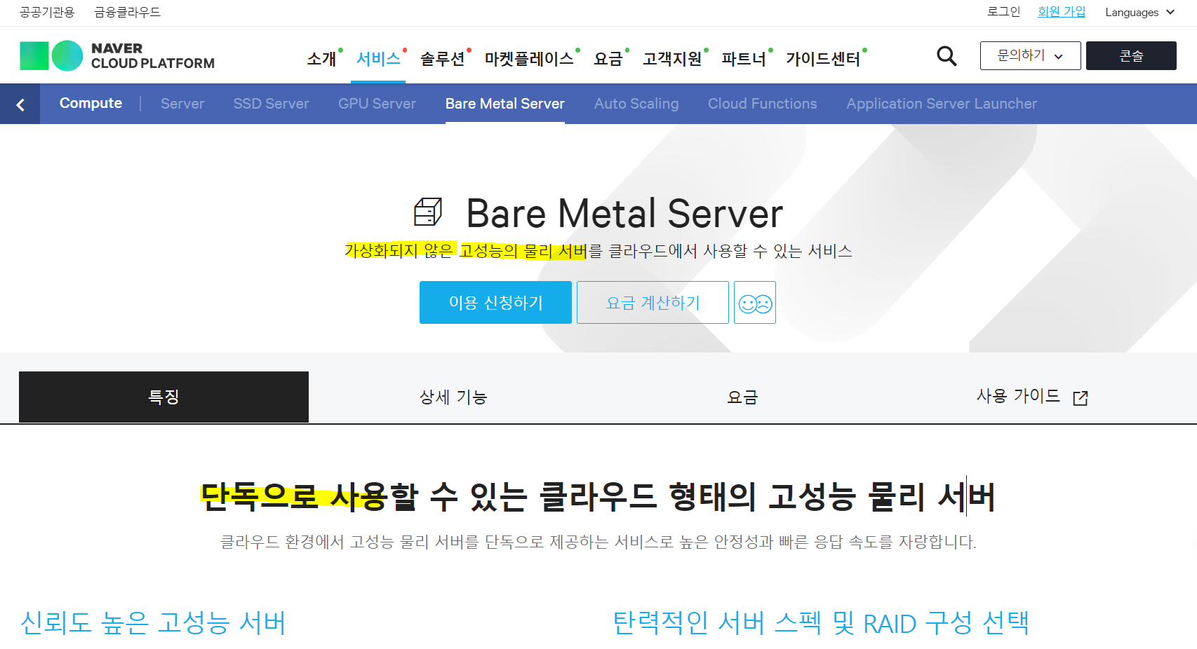 => Bare Metal Server (물리 서버를 단독으로 사용하는 방식이지만 클라우드 서비스 형태로 사용 가능함)