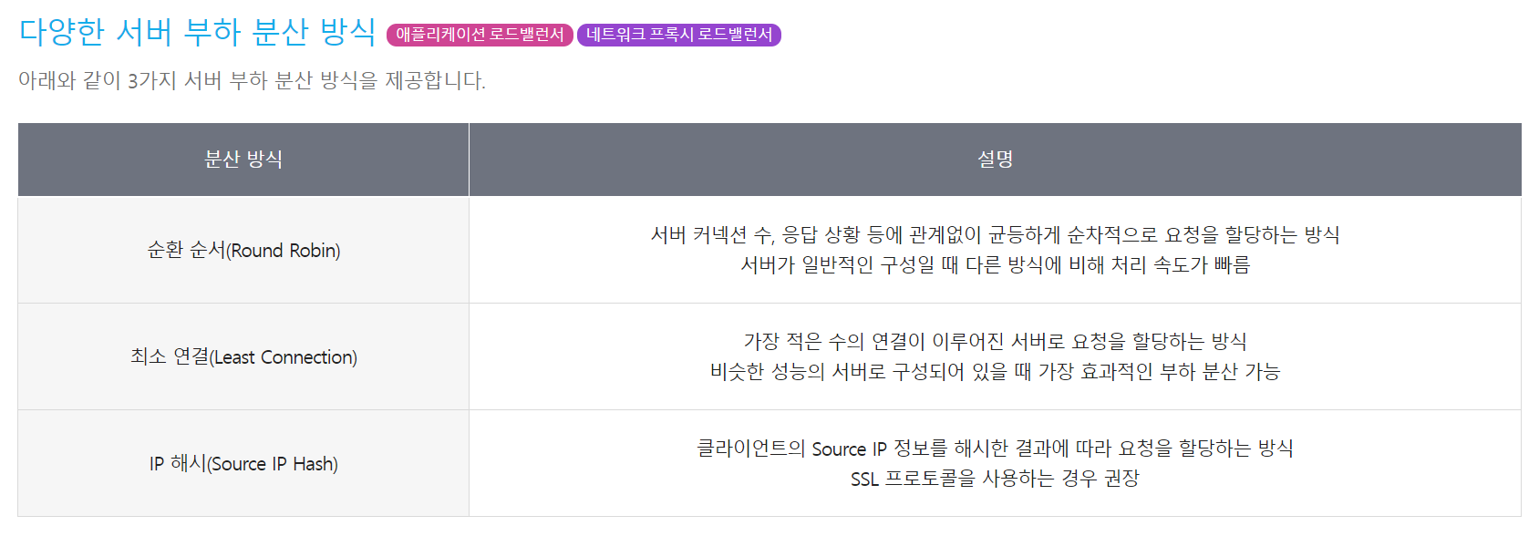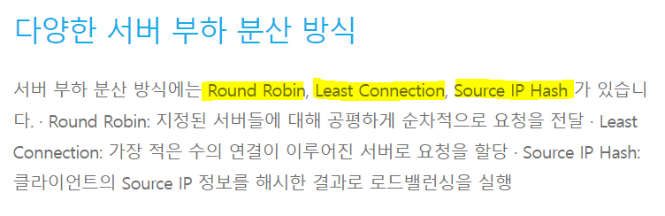 => Round Robin-순환순서, Least Connection-최소연결, Source IP Hash-해시값