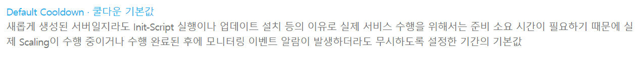 "새로운 서버가 생성되었다고 해도, Init-Script 실행이나 업데이트 설치 등의 이유로 실제 서비스를 수행할 수 있을 정도로 준비되기까지는 시간이 소요될 수 있습니다. 이것은 실제 Scaling이 수행 중이거나 수행 완료된 이후에 모니터링 이벤트 알람이 발생하더라도 무시하도록 설정한 기간입니다."