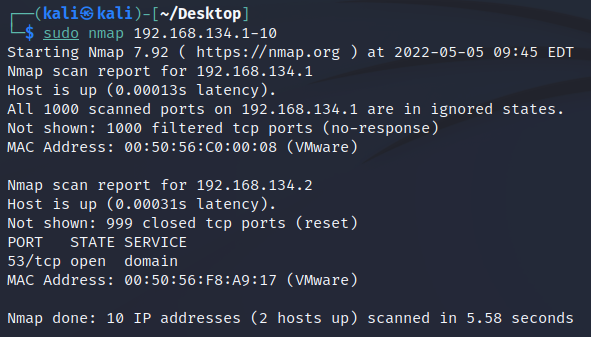 $ sudo nmap 192.168.134.1-50 // XP의 포트스캔이 안되던 차에, Win10이 우연히 잡혔다.