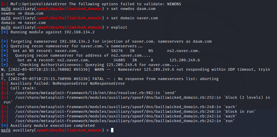 구글 검색결과 msf 해당 공격 모듈로 spoof/dns/bailiwicked_domain 확인됨.