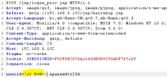 : 우선 작은따옴표로 구문을 닫아준다. (NULL값 생성) 'or'에 이어 TRUE값을 반환하는 값을 입력한다. (1=1 또는 a <b) 뒤이은 구문들은 MS-SQL의 주석 표식인 --로 무효화시킨다.