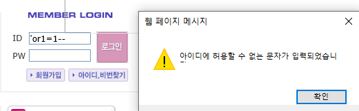: PW이전에 ID 입력란이 먼저 존재한다. 공란일 경우 에러 창이 발생하기 때문에 조건을 TRUE로 만족시킬 ID 정보가 필요하다. 따라서, 접근 가능한 자유게시판에서 ID를 선정하였고 (webmaster) PW에는 위와 동일한 SQL 구문을 삽입한다.