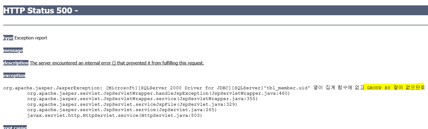 정상적인 SQL 쿼리 구문상에서 having은 group by이 선행되어야 한다. group 지정 없이 having만 전달될 경우 서버 측 오류를 나타내는 HTTP500 메시지를 나타내며 DB에 대한 정보를 노출시킨다.
