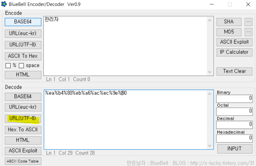 %ea%b4%80%eb%a6%ac%ec%9e%90 : 관리자 : %구분 => 십육진수 => UTF8로 변환