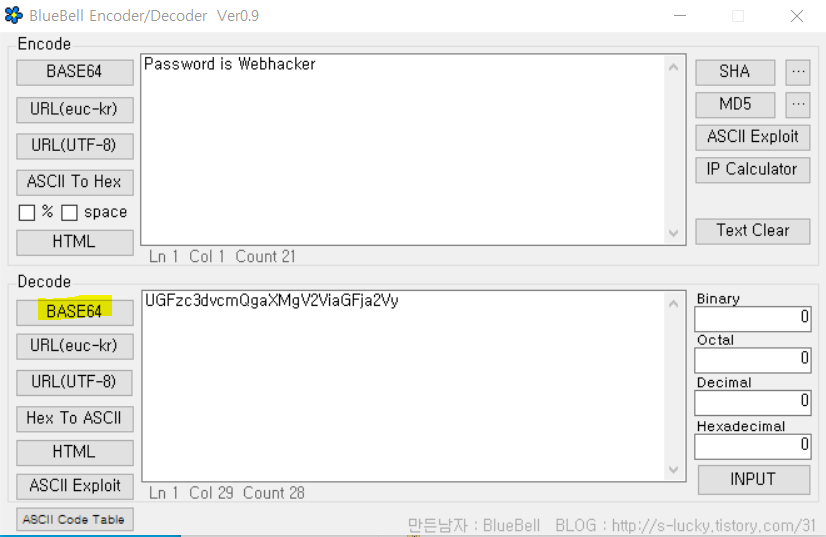 UGFzc3dvcmQgaXMgV2ViaGFja2Vy : Password is Webhacker : 대문자 소문자 사용 => Base64