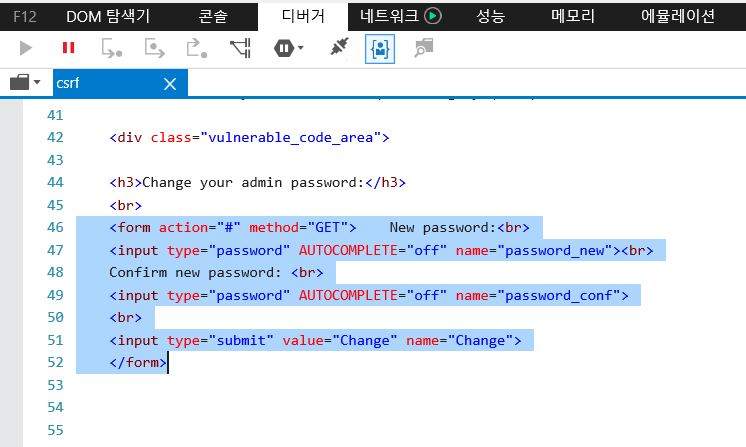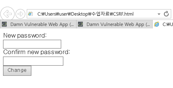 - 46번 줄 #에 URL 주소 'http://192.168.5.130/dvwa/vulnerabilities/csrf/' 붙여 넣기