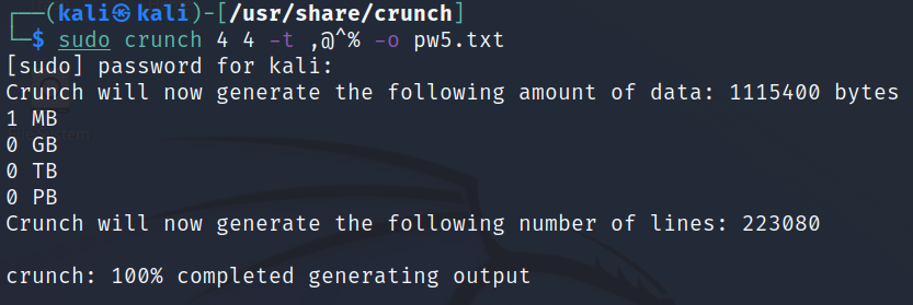 $ sudo crunch 4 4 -t ,@^% -o pw5.txt
