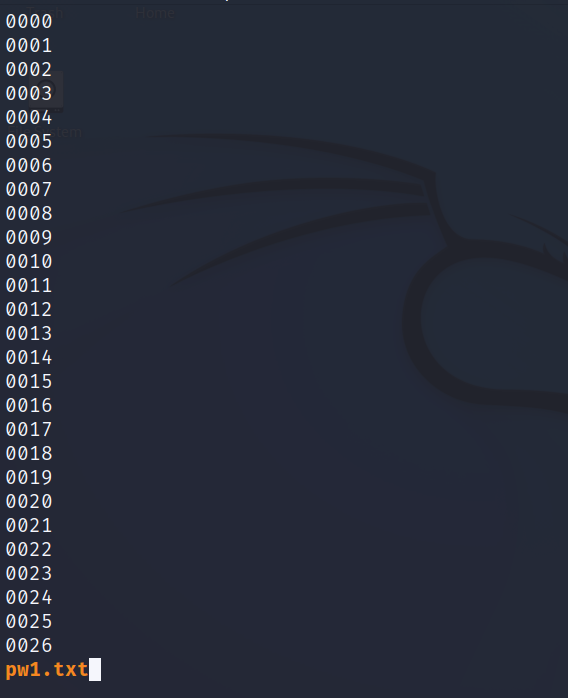 $ sudo crunch 4 4 0123456789 -o pw1.txt