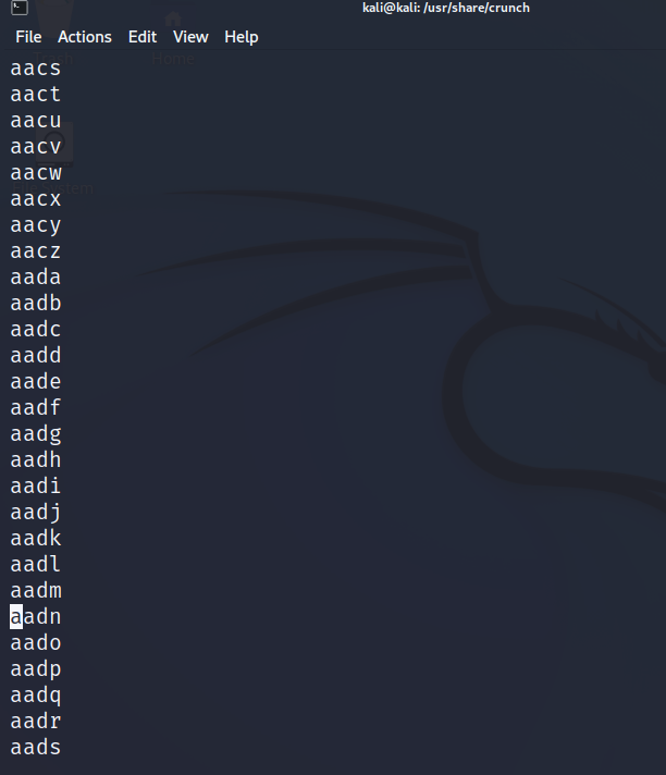 $ sudo crunch 4 4 -f charset.lst lalpha -o pw2.txt