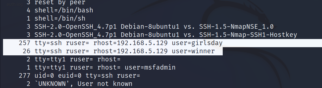 $ sudo medusa -h 192.168.5.130 -u girlsday -P pw5.txt -M ssh -t 16 // -t :thread 16개 동원하여 진행