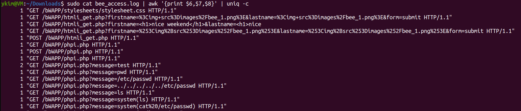 $ sudo cat bee_access.log | awk '{print $6,$7,$8}' | uniq -c