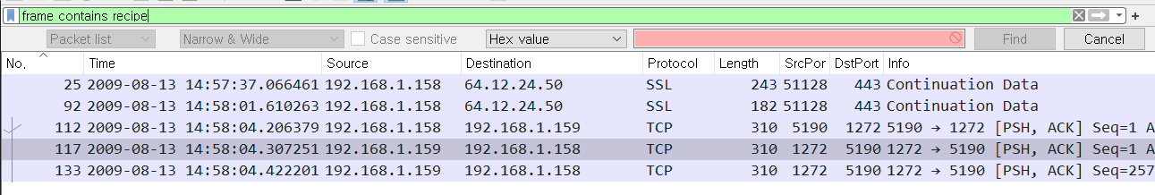 - Ann의 IP 192.168.1.158 위주로 확인 => Wireshark검색 ip.addr == 192.168.1.158'