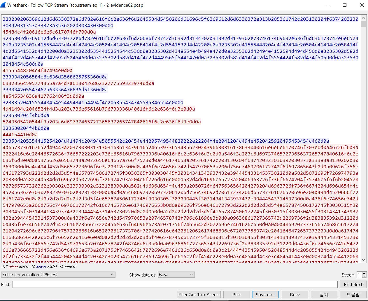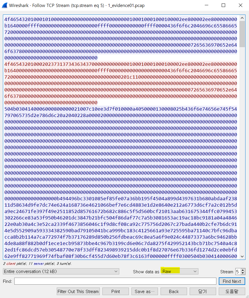 - 첫 번째 패킷의 TCP Follow확인