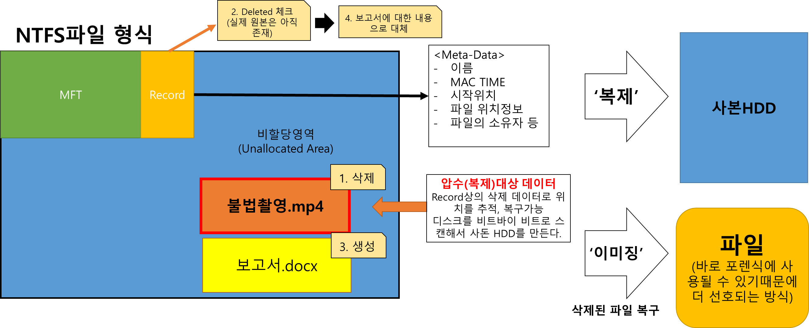 : 복제 = 필요한 대상 파일만 복제함 // 이미징 = Unllocated 공간까지 bit to bit 모두 복제