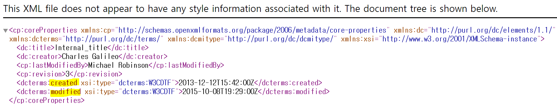 : MS문서의 확장자를. zip 파일로 변경 => 압축 해제후 'docProps' > 'core.xml' 확인