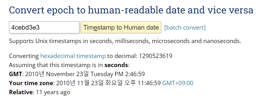 : 유닉스의 시각표시법으로, 1970년 1월 1일 0시 0분 00초 (UTC)부터 경과시간을 초로 환산한 정수 값을 의미한다.