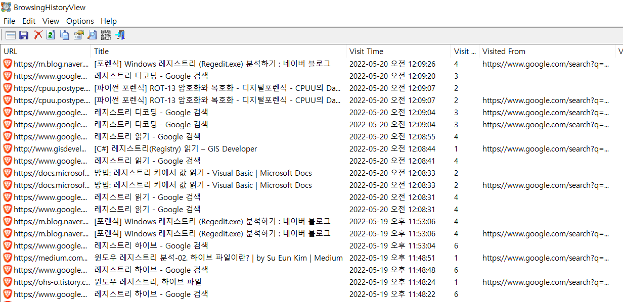 : 참조 파일의 볼륨과 경로, 크기, 처음 접한 컴퓨터의 MAC 주소 등이 나와있다. 포렌식에서 원본 파일이 유실된 경우 유용한 자료가 될 수 있다. ex) 브라우저 > 우클릭 > 최근 방문한 웹사이트 목록