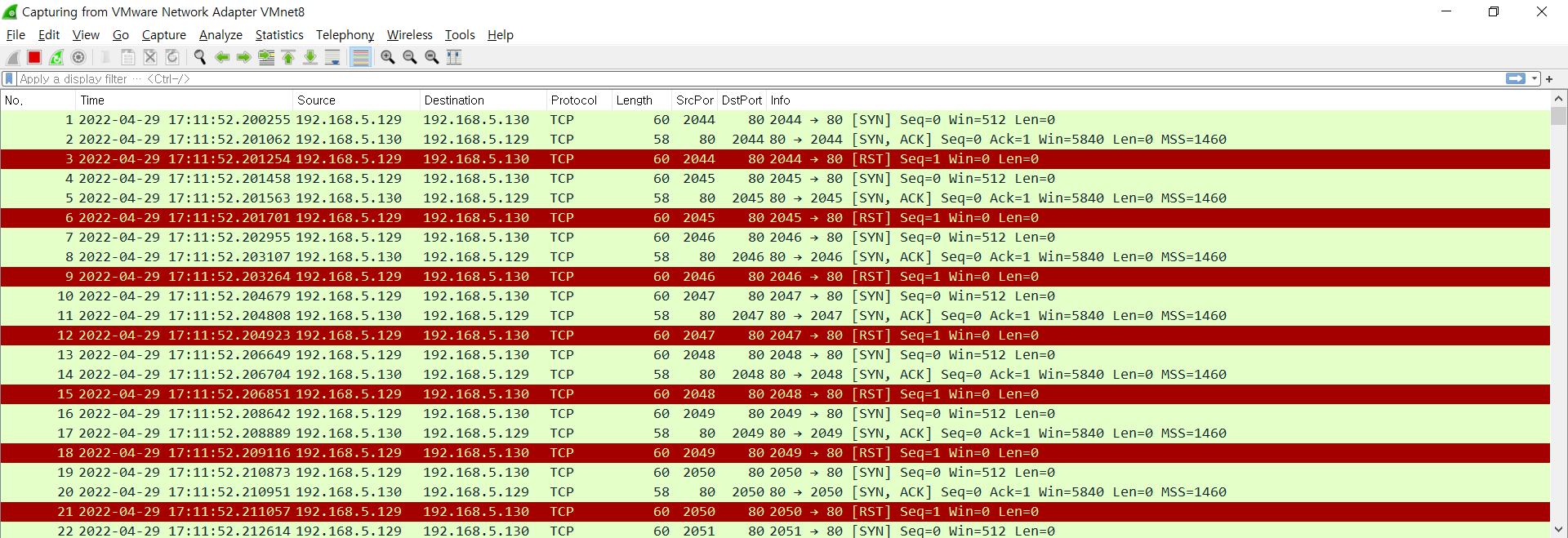 $ sudo hping3 -S 192.168.5.130 -p 80 -i u1000