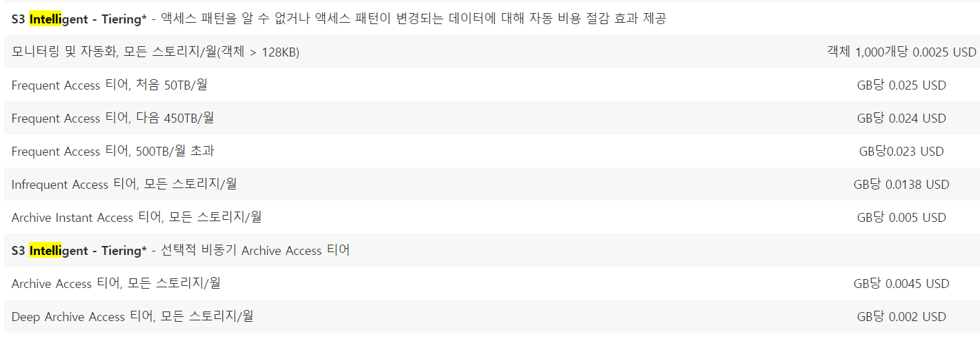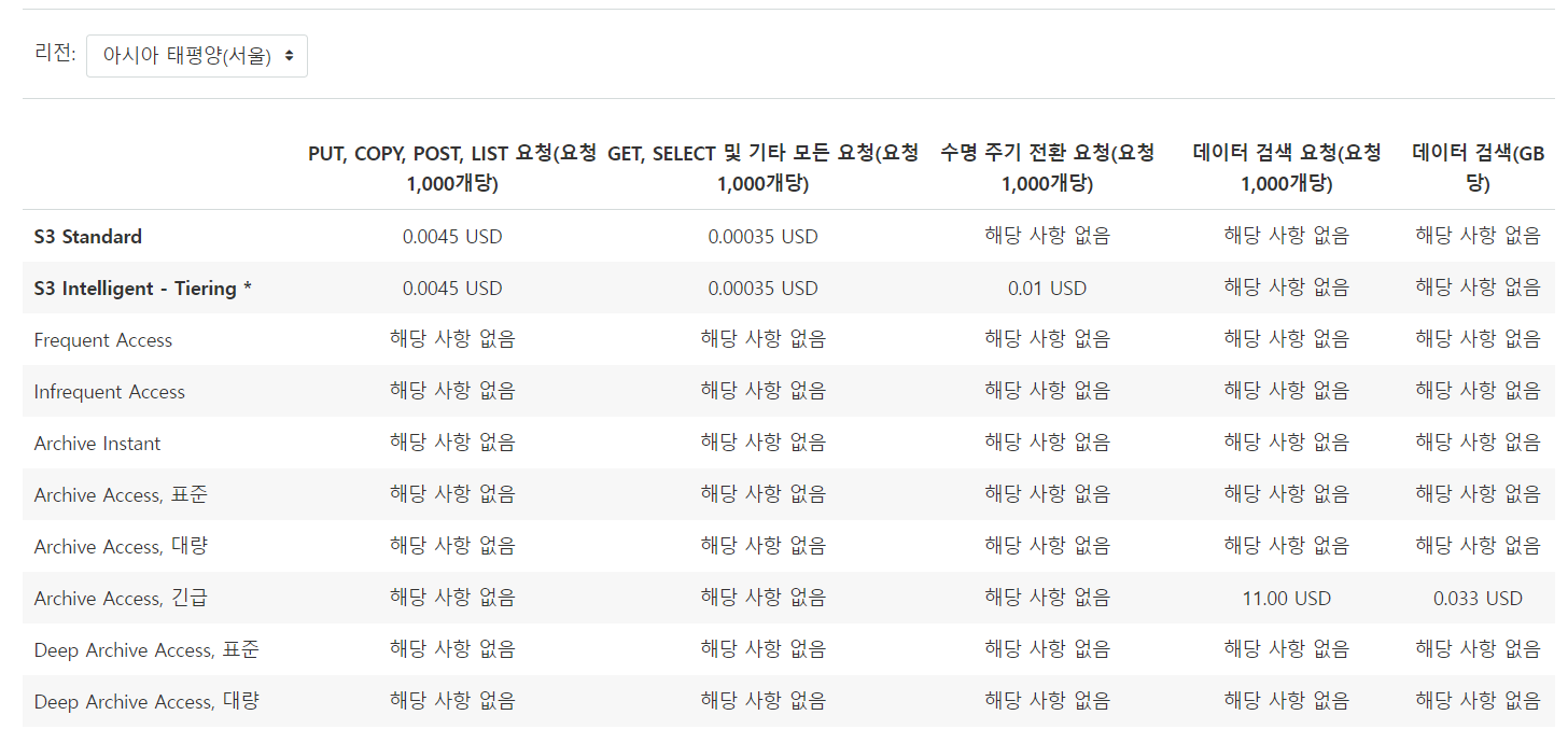 Standard-IA(Infrequent Access): 0.0125 USD/GB $12.5/TB (15,000원) => 엑세스가 적을 경우 적합 / 인출비용 발생