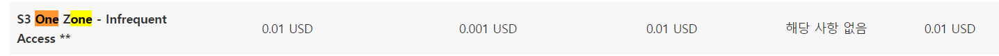 One Zone-IA: 0.011USD/GB, 하나의 Zone에만 저장하기 때문에 유사시 복구 문제나 가용성 저하 측면이 있음