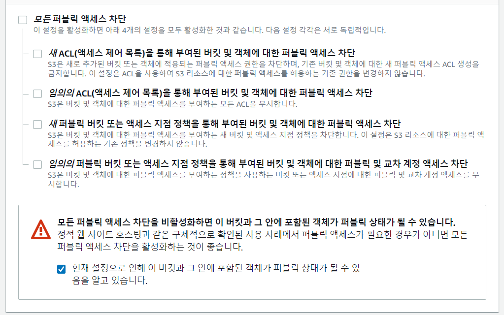 : aws검색창에서 'S3'입력 후 클릭 => 버킷 만들기 (계정 당 최대 100개 까지 생성가능)