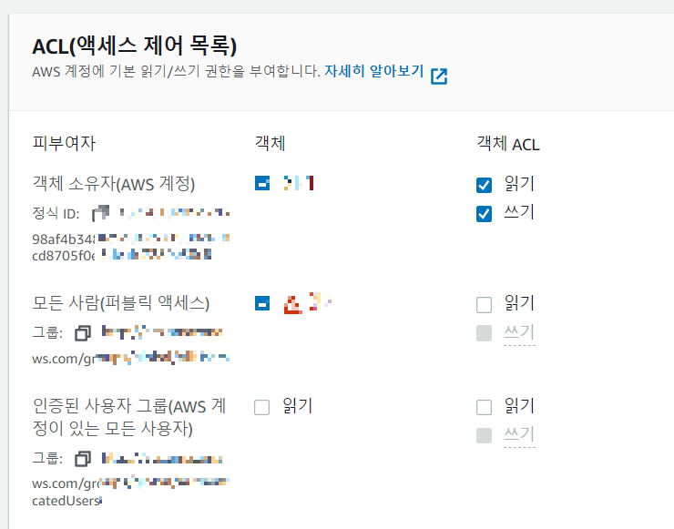 : 3S에선 버킷과 객체에 대한 권한을 각각 설정한다. 둘 중 하나라도 권한이 부여되지 않은 사용자의 접근이 거부된다.