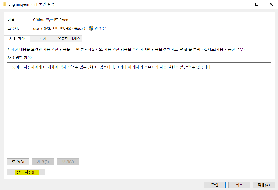: 해당하는 암호화키(.pem)는 윈도우 cmd에서 다루기 쉬운 C:\Intel 로 위치시켰다. 암호화키의 접근 권한에 대해 아래와 같이 설정한다. (리눅스로 따지면 chmod 400 작업)