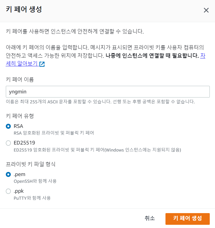 - cmd 실행 > 인스턴스 연결 ssh -i "yngmin.pem" ubuntu@IP주소 복사하여 ssh연결 완료