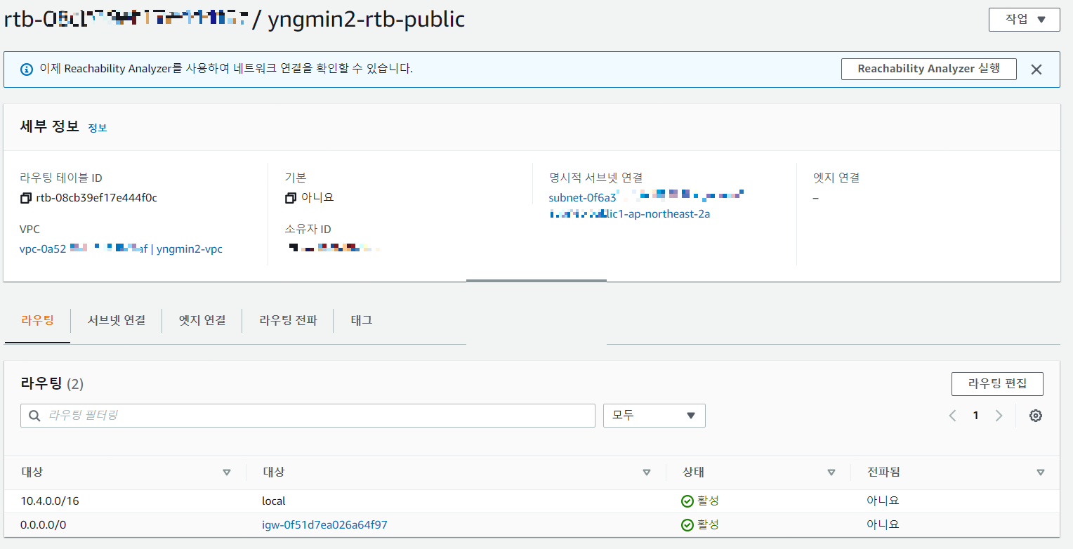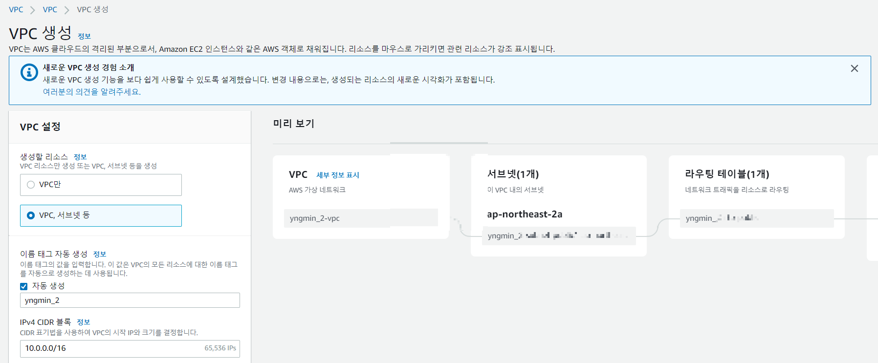 'VPC,서브넷 등'을 통해 VPC와 연결되는 모든 네트워크 개체들을 자동으로 설정할 수 있다. IP값은 중복 없이 자동으로 부여되며, 생성된 태그는 서브넷, 라우팅 테이블의 태그로 동일하게 지정된다.