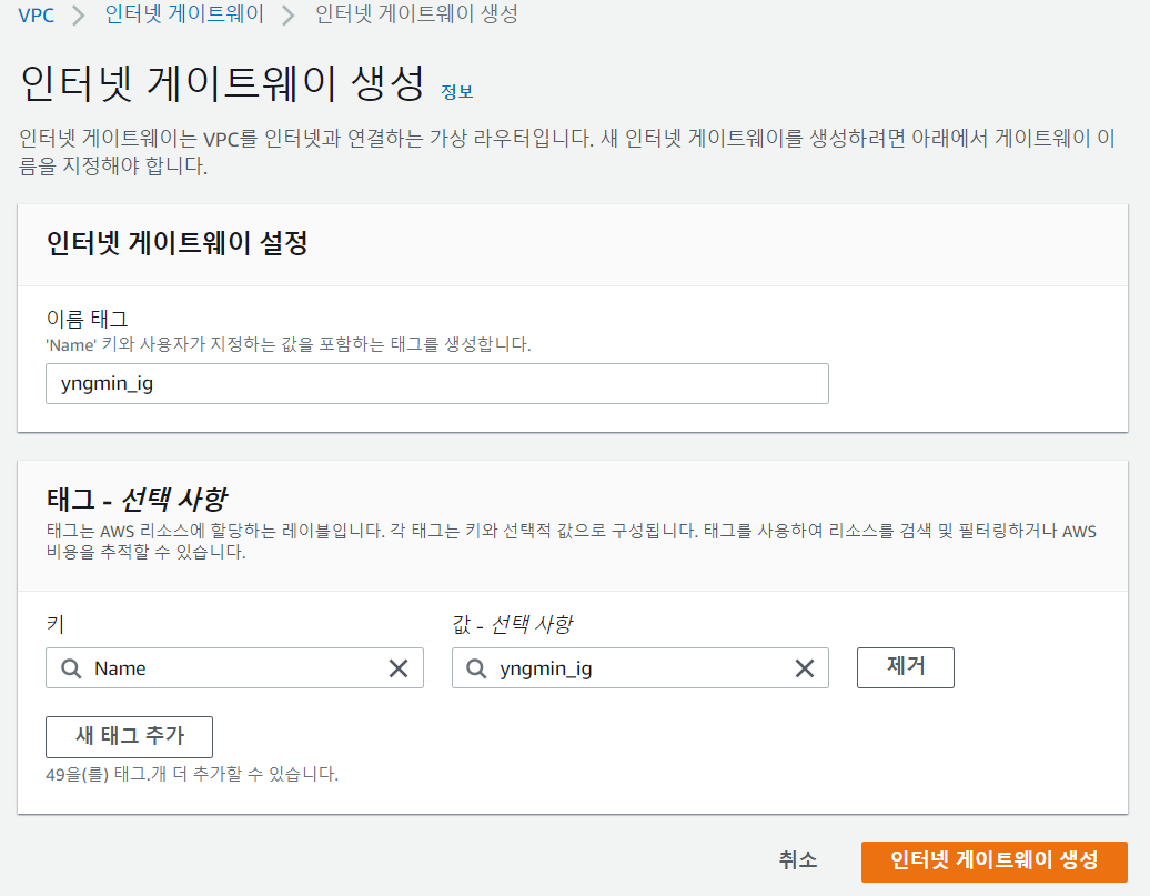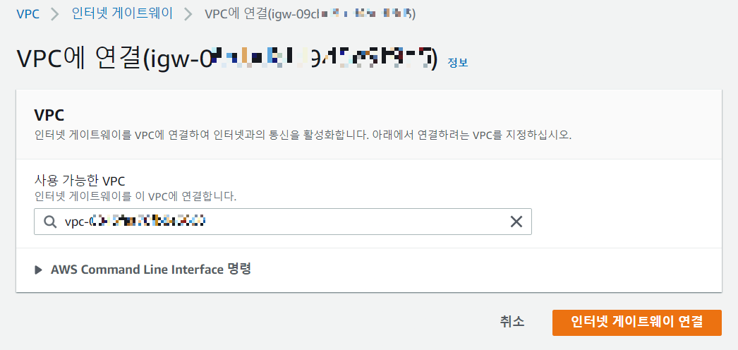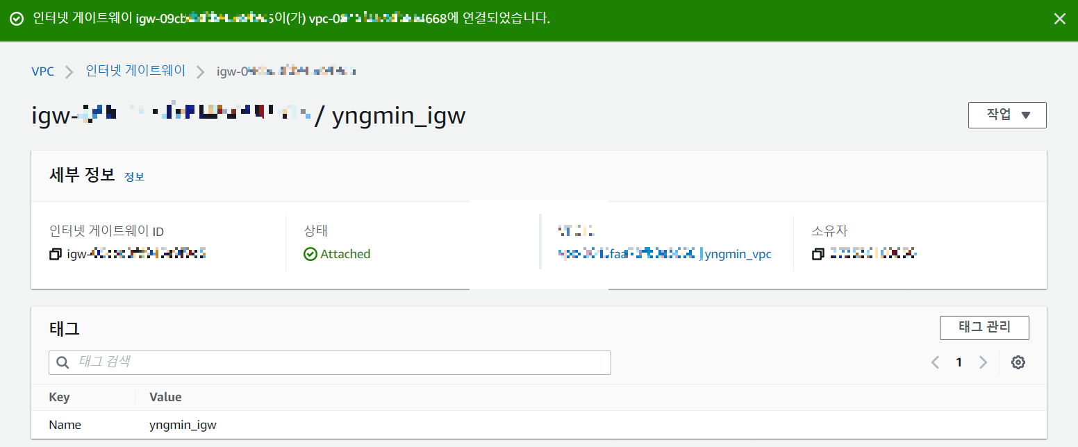 인터넷 게이트웨이 > 작업 > VPC에 연결 > 해당 VPC선택