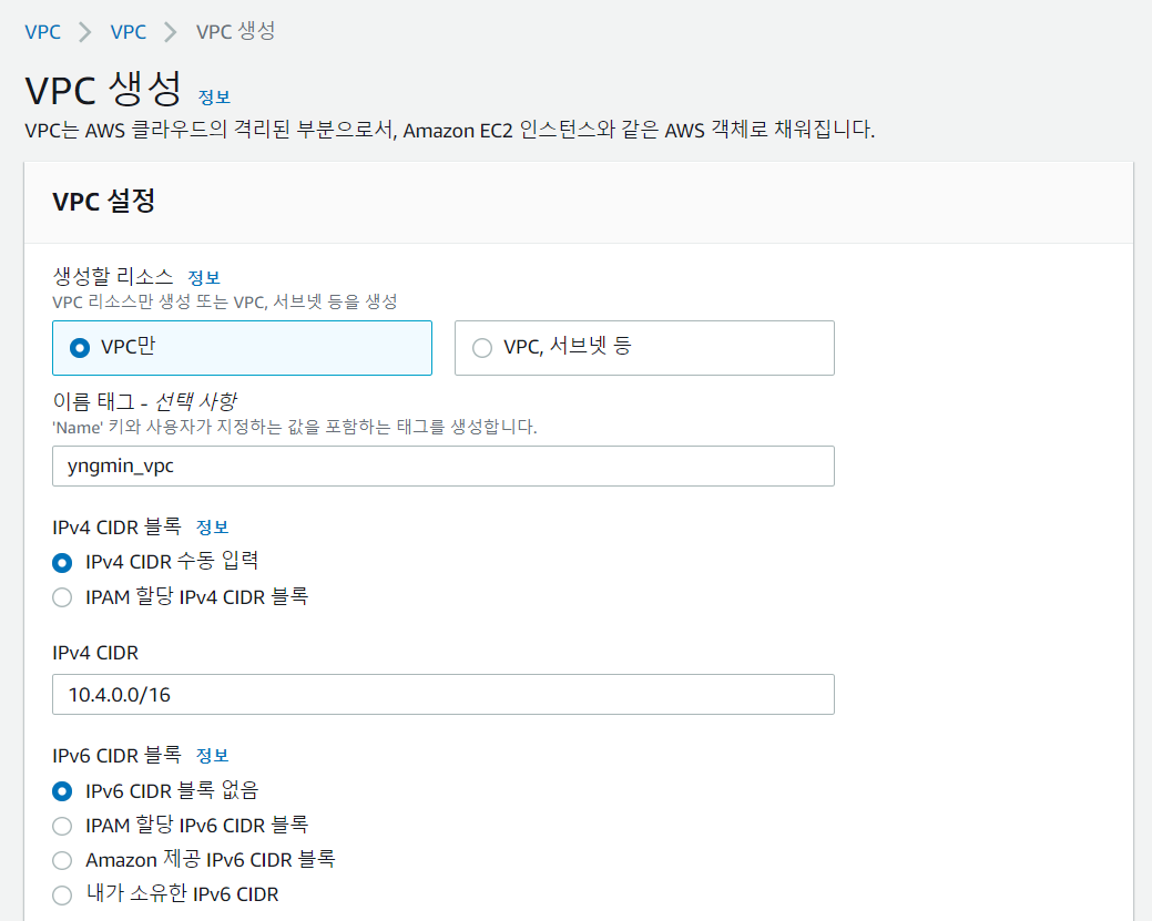 Create VPC > IPv4 CIDER 입력, 기본값 > VPC 생성