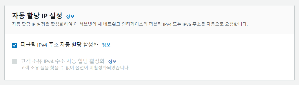작업 > 서브넷 설정 편집 > 퍼블릭 IPv4 주소 자동 할당 활성화 체크