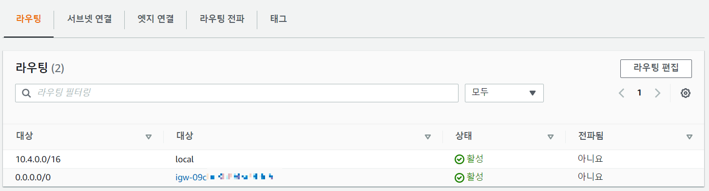 라우팅 테이블 > 라우팅 > 라우팅 테이블 편집