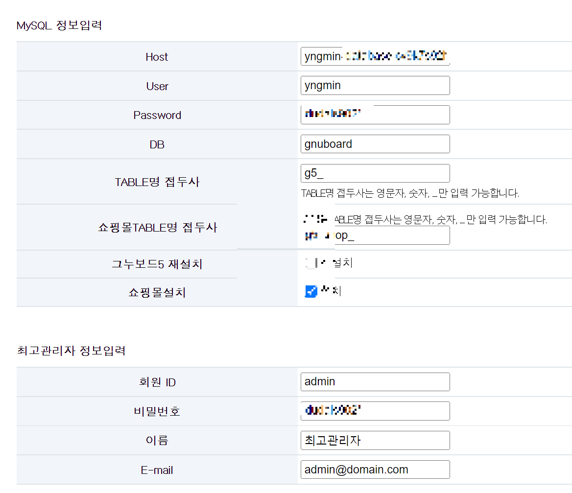 //외부접속 가능하도록 '%'로 설정mysql> grant all privileges on gnuboard.* to board@'%' ; //board에게 gnuboard의 모든 테이블 권한 부여