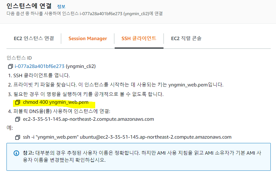 : 프라이빗키를 우분투로 복사, 아래 ssh접속 명령어 사용
